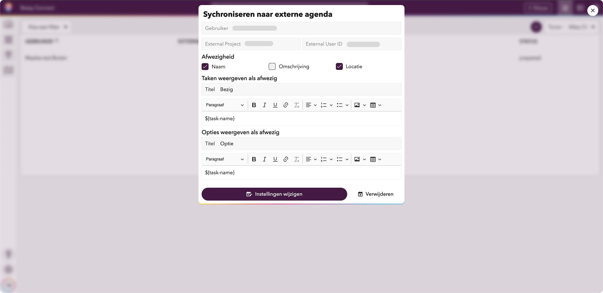 Je kunt per koppeling instellen hoe deze afwezigheden eruit moeten zien. Dit doe je door in het overzicht op de koppeling te klikken. Er zijn instellingen mogelijk aan zowel de ontvangende als de versturende kant.