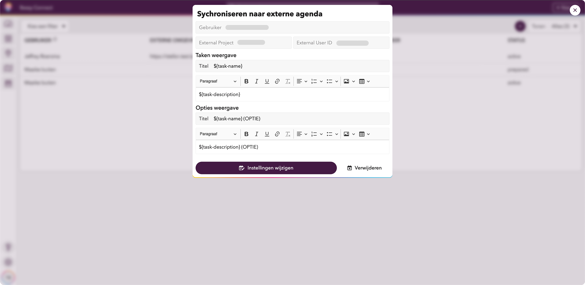 Taken die je zelf inplant in je agenda (of die uit andere gekoppelde omgevingen komen), worden als afwezigheid doorgegeven aan de opdrachtgever. Zo voorkomt Bessy dubbele planning. Je kunt hierbij instellen: