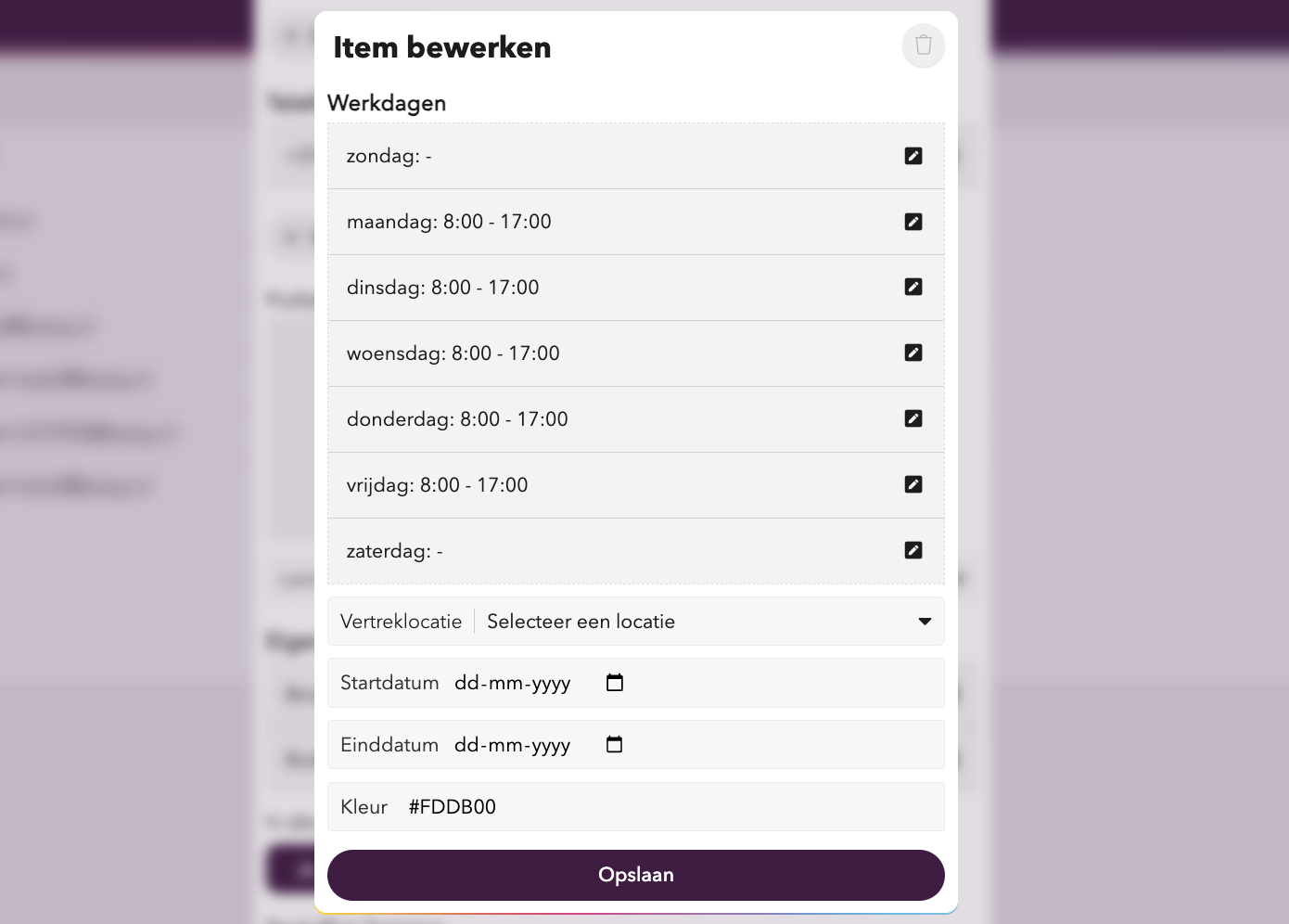 Je kunt hier ook per dag een aparte vertreklocatie selecteren en de maximale reistijden instellen voor Planbot. Let op: Deze instellingen gelden enkel voor deze gebruiker op deze specifieke dag en overschrijven de standaard configuratie van Planbot.