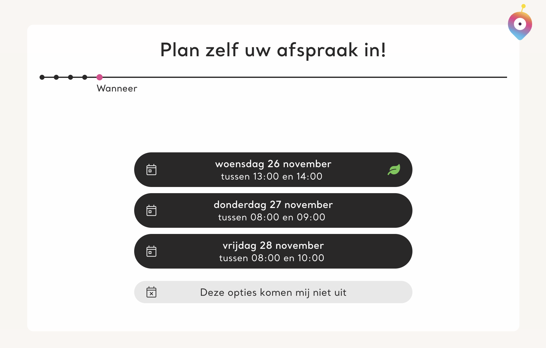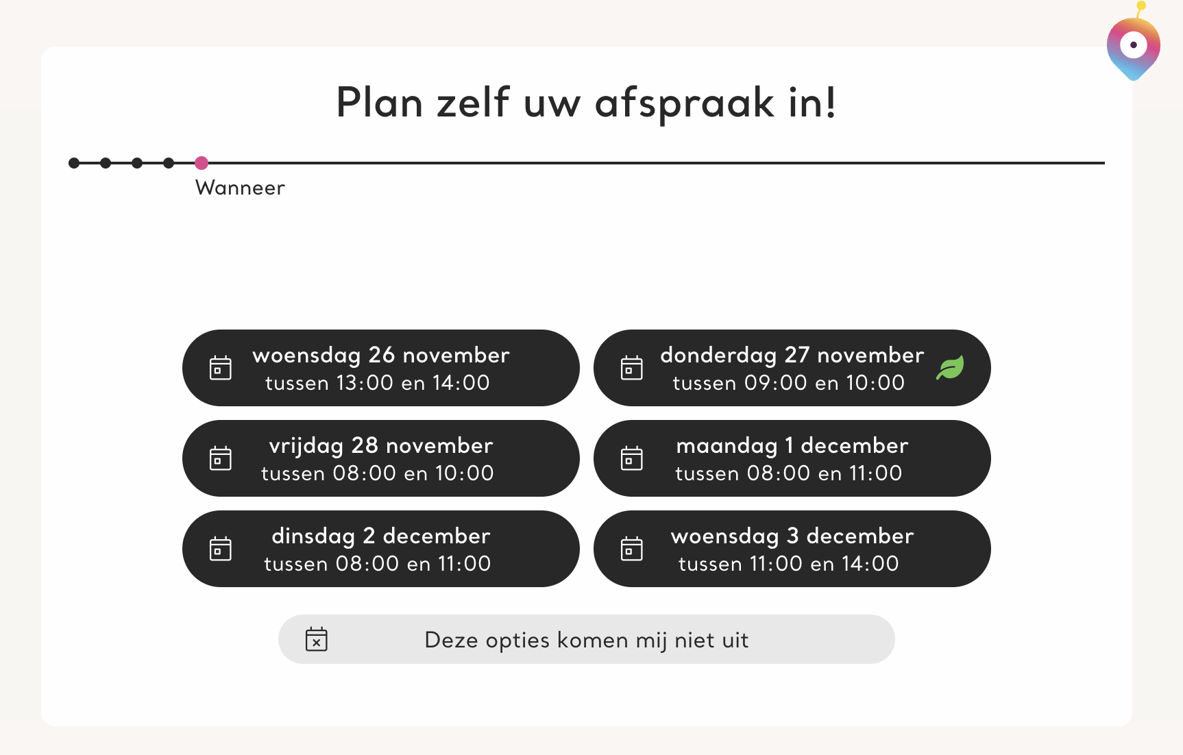De klant kan nu zelf één van de voorgestelde opties kiezen of aangeven dat deze moment niet uitkomen. Dit laatste scenario bespreken we verder op deze pagina.