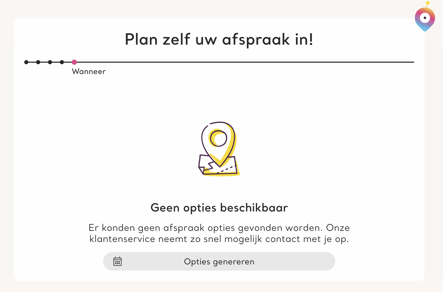 Wanneer de planning helemaal vol zit of wanneer de klant zich buiten jouw plangebied bevindt, kan het zijn dat er geen opties gevonden kunnen worden. Dit is direct zichtbaar in de backoffice zodat een medewerker daar snel op kan reageren door contact op te nemen met de klant.
